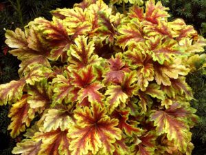 КУСТ ВЫСОТОЙ 18-20СМ, ШИРИНОЙ 40-43СМ. ЛИСТЬЯ ПАЛЬЧАТО-РАССЕЧЕННЫЕ, ПЯТИЛОПАСТНЫЕ, ЯРКО-ЖЕЛТОГО ЦВЕТА С ТЕМНО-КОРИЧНЕВО-КРАСНЫМ УЗОРОМ ВДОЛЬ ОСНОВНЫХ ЖИЛОК. ЦВЕТЕТ В ИЮНЕ-ИЮЛЕ МАЛЕНЬКИМИ БЕЛЫМИ ЦВЕТКАМИ. ПРЕДПОЧИТАЕТ ЛЕГКИЕ, УМЕРЕННО УВЛАЖНЕННЫЕ ПОЧВЫ, СОЛНЦЕ ИЛИ ПОЛУТЕНЬ.