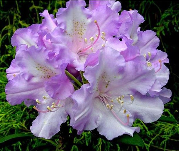 Вечнозеленый компактный кустарник. Цветение в мае-июне, цветки крупные с гофрированными краями. Бутоны насыщенного сиренево-розового цвета. Кожистые листья, темно-зеленые. К 10-ти годам высота и ширина около 0,8-1м. Морозостойкий.